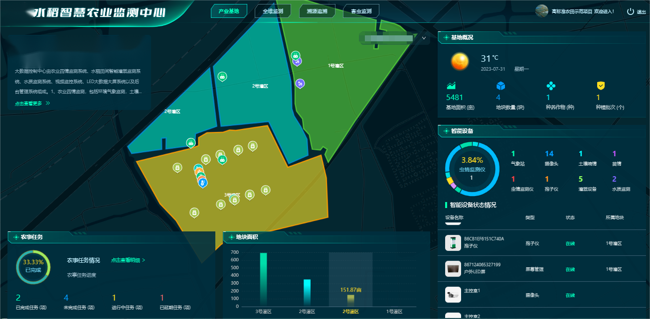 通過GIS二維地圖展示基地以及所在區域的地塊、農作物、物聯網智能設備,可查看地塊、農作物詳情、物聯網設備實時數據、歷史數據和實現設備遠程操控。