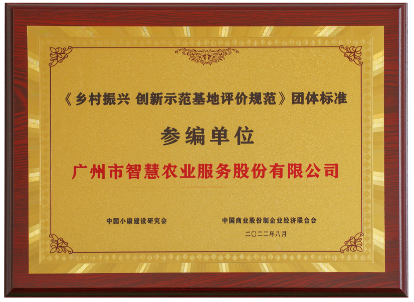 廣州市智慧農業服務股份有限公司受邀參加此次論壇大會,并獲頒由中國小康建設研究會、中國商業股份制企業經濟聯合會組織的《鄉村振興 創新示范基地評價規范》、《鄉村振興 產業示范基地評價規范》團體標準參編單位榮譽。