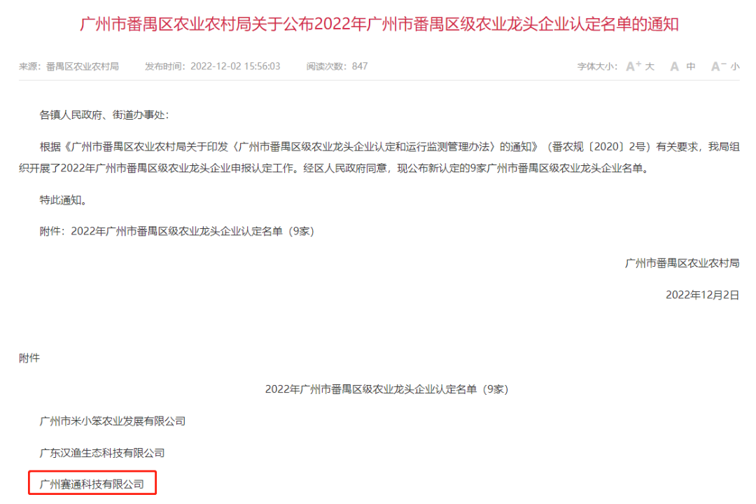 12月2日,番禺區農業農村局公布“2022年廣州市番禺區級農業龍頭企業認定名單”,本次認定名額包含9家企業,廣州市智慧農業服務股份有限公司子公司廣州賽通科技有限公司赫然在列,接下來,賽通科技將繼續致力于推進農業產業數字化升級創新,助力提升農業行業的社會化服務能力。