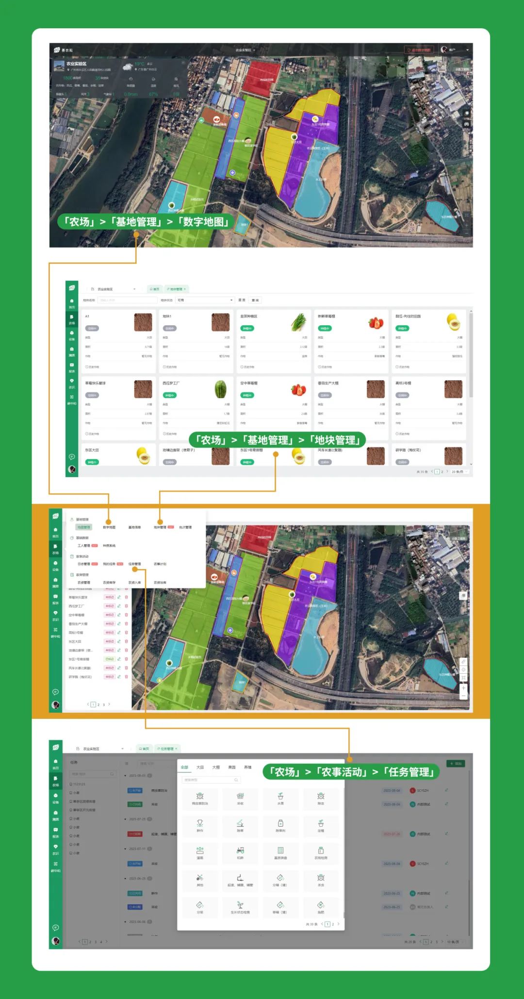 包括了基地管理、基礎管理和農事活動三大農業管理板塊。通過賽農耘的農場耘體系,可以遠程進行地圖管理、地塊管理、工人管理、農事計劃、任務管理等智慧管理工作,還可通過數字地圖查看管理各地塊數據和設備情況。