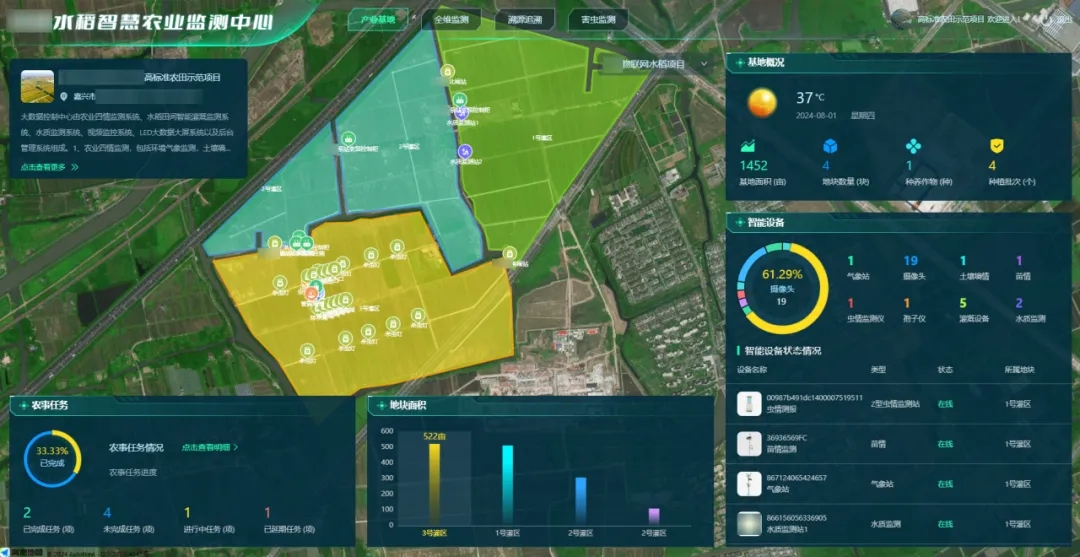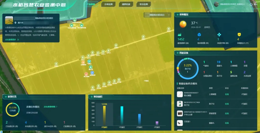 可視化大數(shù)據(jù)平臺(tái):平臺(tái)實(shí)時(shí)展示基地及所在區(qū)域地塊信息、水稻生長(zhǎng)詳情、物聯(lián)網(wǎng)智能設(shè)備遠(yuǎn)程操控及運(yùn)行狀態(tài)、農(nóng)事任務(wù)進(jìn)展等數(shù)據(jù),將區(qū)域內(nèi)的農(nóng)業(yè)信息可視化呈現(xiàn)。