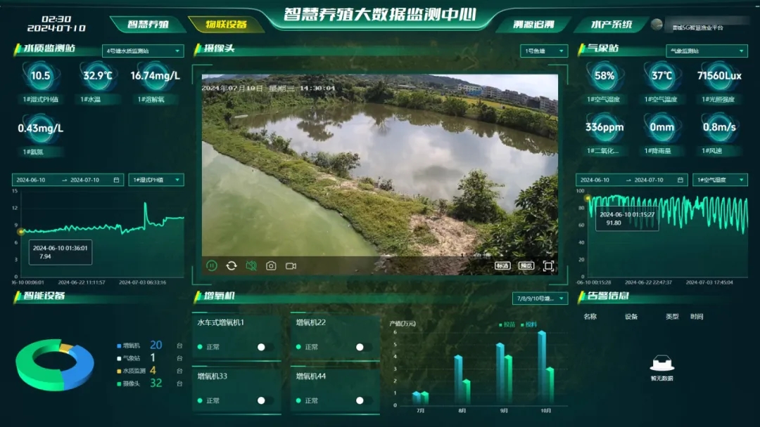 智能控制設(shè)備:多點(diǎn)位布設(shè)智能增氧機(jī)等控制設(shè)備,支持遠(yuǎn)程控制、電話告警、智能保護(hù)、定時(shí)開關(guān)、設(shè)備聯(lián)動(dòng)等功能。