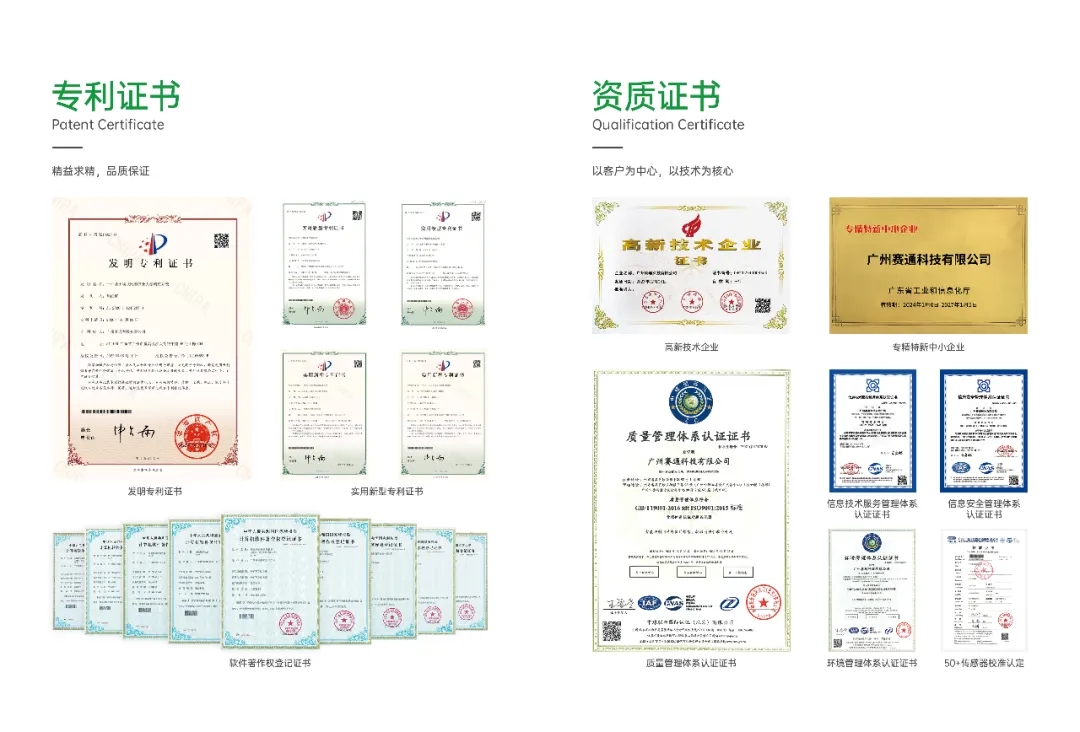 廣州賽通科技有限公司持續把脈農業數字化進程中的關鍵因素,積極響應國家政策,以數字科技創新賦能精準農業,累計獲得30余項產品檢驗認證、計量認證等相關證書和50余項專利及軟件著作權,以及國家高新技術企業、廣東省專精特新中小企業等資質榮譽。