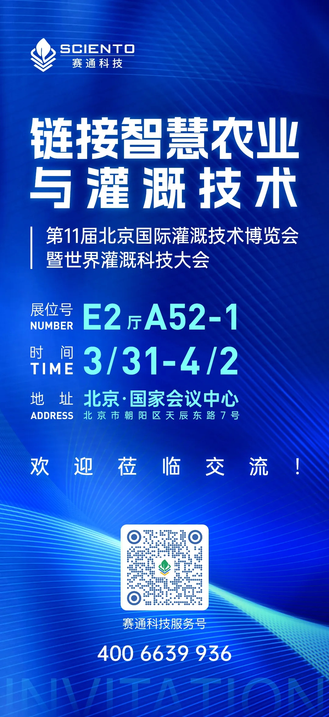 2025年3月31日-4月2日,第11屆北京國際灌溉技術博覽會暨世界灌溉科技大會將在北京國家會議中心盛大開幕,廣州賽通科技有限公司將攜最新技術與產品亮相E2廳A52-1展位,現誠邀您蒞臨現場,共同探討數字科技如何助力灌溉農業高質量發展,開啟無限可能。
